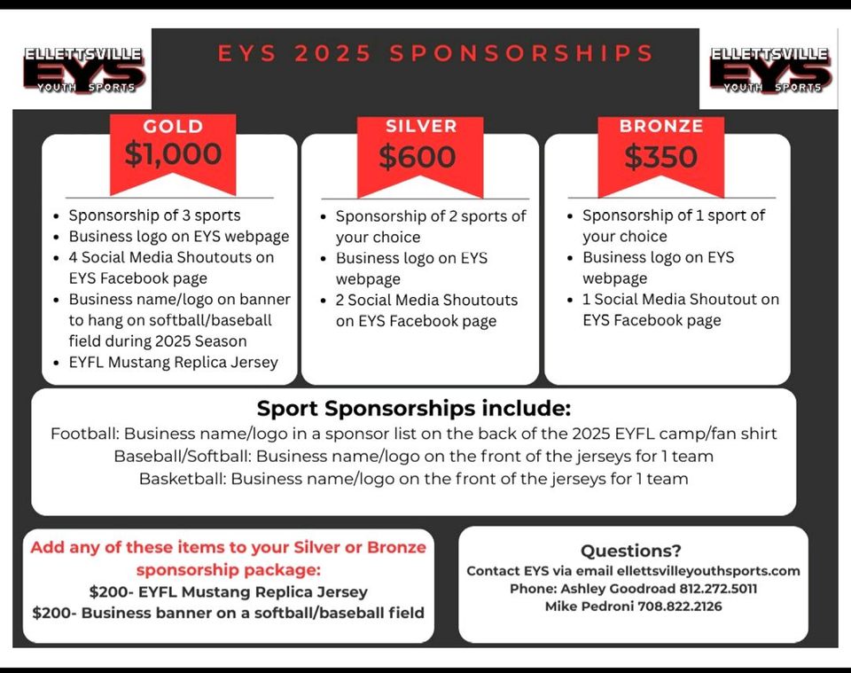 Interested in being a sponsor for Ellettsville Youth Sports? We have options to let you or your business support our teams!